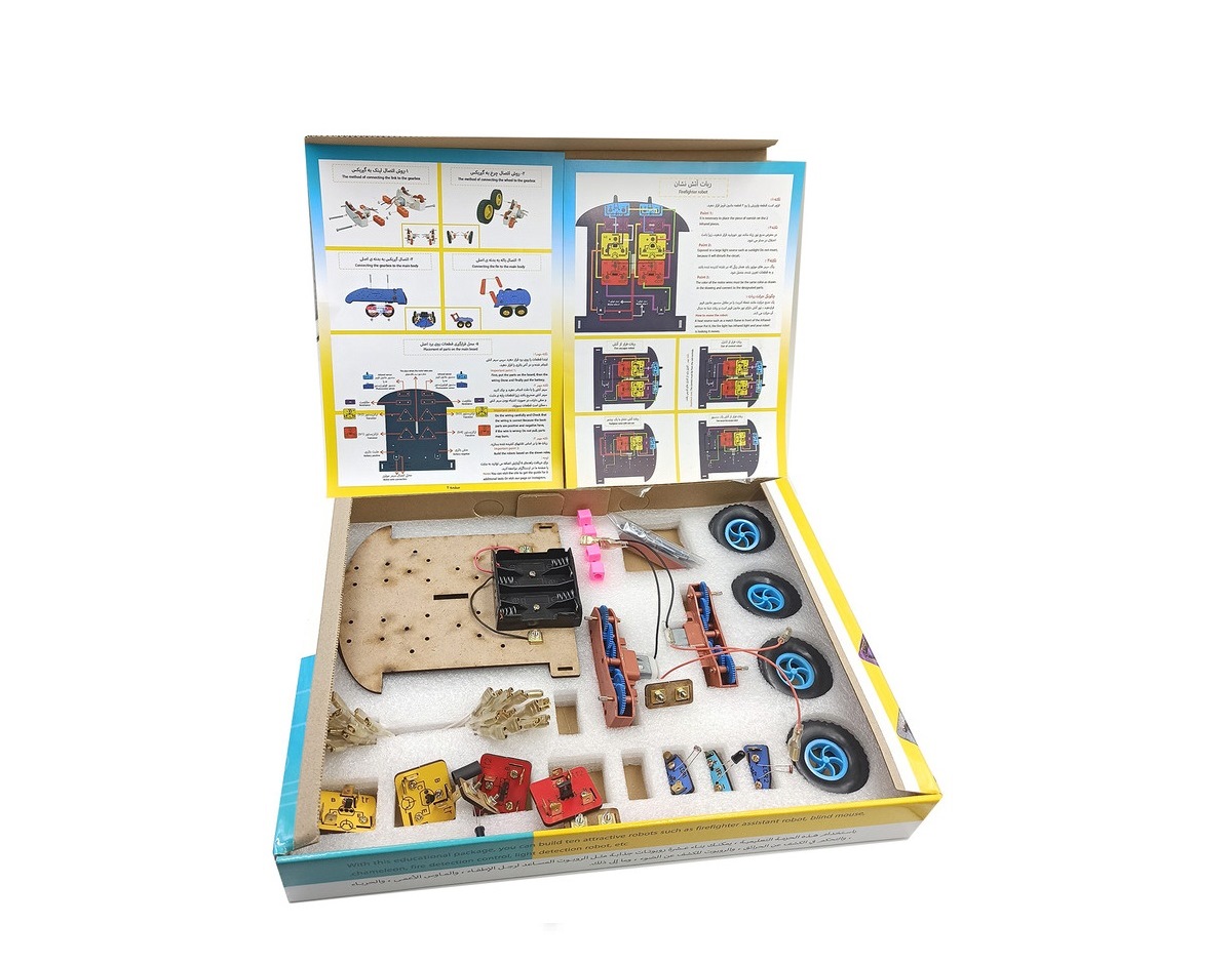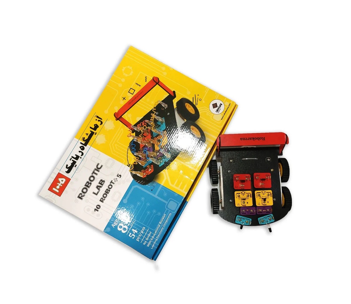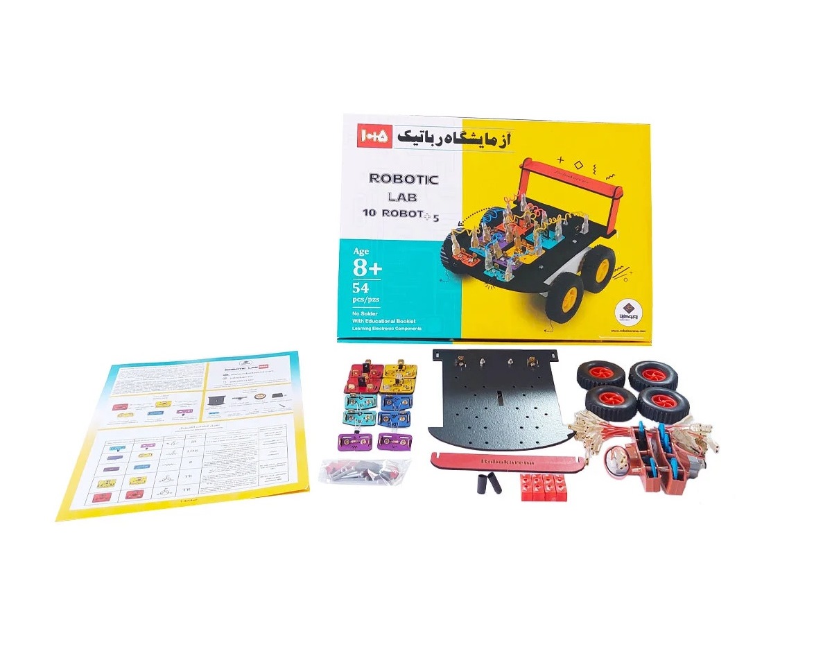 آزمایشگاه رباتیک شامل ساخت ۱۰ ربات جذاب هوشمند به همراه ۵ ربات با کمک کیت آزمایشگاه الکترونیک می باشد. مدار های کاربردی نیاز به لحیم کاری ندارند و مناسب پروژه های دانش آموزی است.