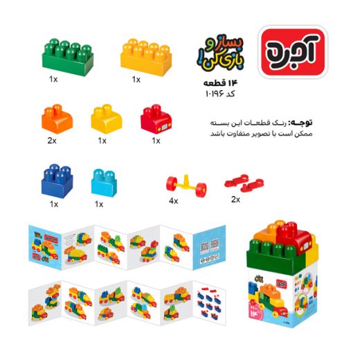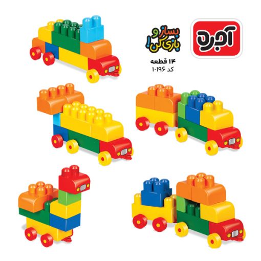 ۱۴ قطعه آجره در رنگهای متنوع و قطعه چاپدار. همراه با چرخ و اتصال قطاری برای سنین ۱ سال به بالا همراه با ایده ساخت چندین ماشین و وسیله نقلیه
