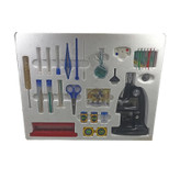فیلتر رنگی – ذره بین – ۶ عدد لام – لامل – پنس – قیچی – پیمانه مدرج – قطره چکان – قاشق کوچک – قیف – ظرف نگهداری نمونه – ۲ عدد لوله آزمایش بلند – ۳ عدد لوله آزمایش کوتاه – فرچه تمیز کننده لوله آزمایش – جای لوله آزمایش – اسفنج – برچسب – نمک دریایی – نمونه بال پروانه – بروشور راهنمای فارسی