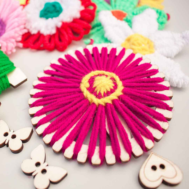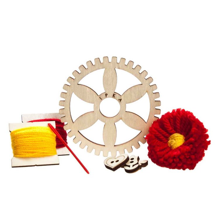 دار گل بافی، کاموا، دکمه چوبی، سوزن پلاستیکی، برگه ی راهنمایی بافت و برگه ی ایده هایی برای بافت